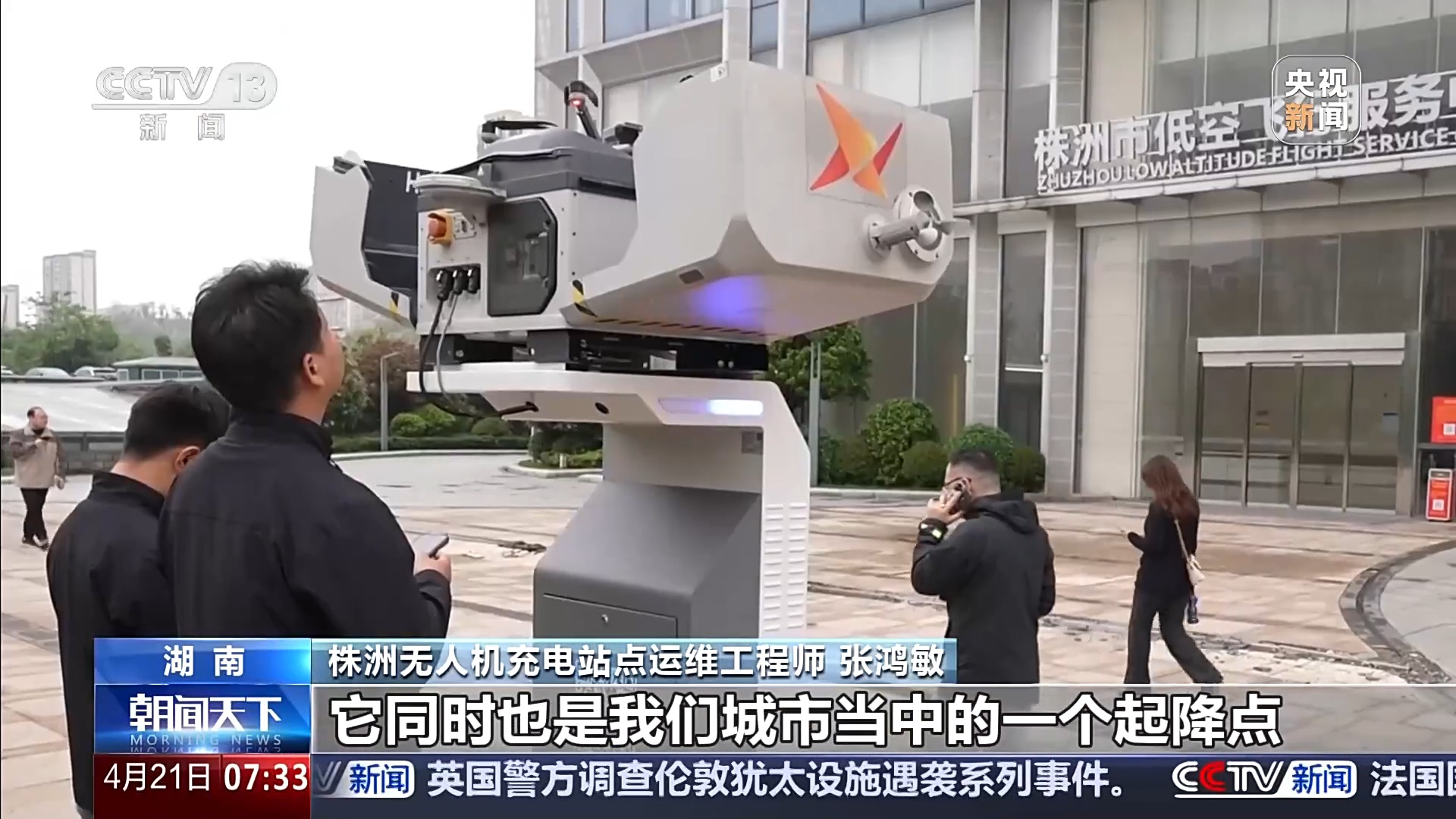 湖南株洲无人机充电站点运维工程师 张鸿敏:这个就是我们用于城市管理的无人机,可以在里面充电,它同时也是我们城市当中的一个起降点。